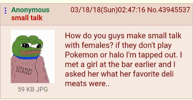@matrix Talking about pokemon has worked wonders for me. Of course, most of the adults who like it are autistic furries, but whatever, that describes most of my friends. Worst case scenario, they just assume you're a pedophile, and actually, now that I think about it, maybe this is a bad idea.