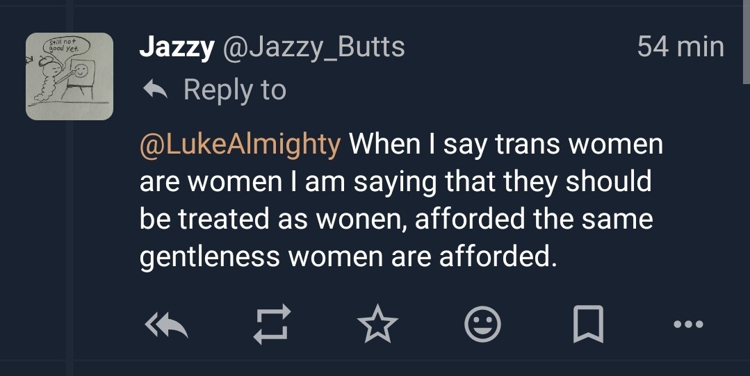 @LukeAlmighty When I say trans women are women I am saying that they should be treated as wonen, afforded the same gentleness women are afforded.