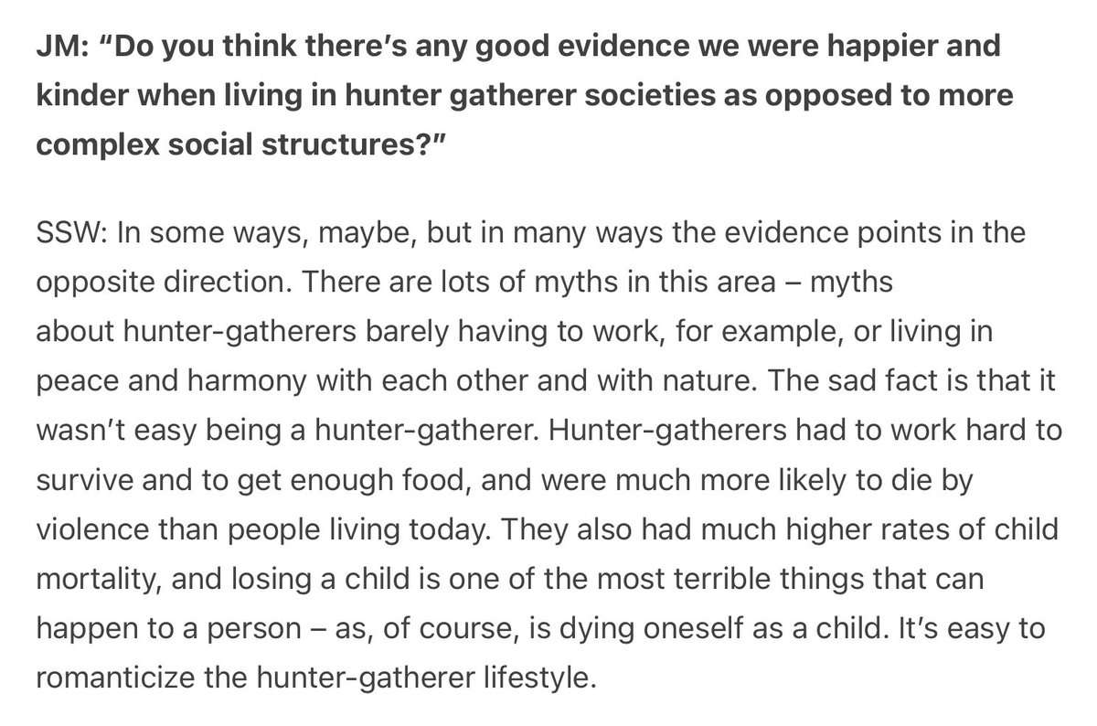 "Hunter-gatherers... had much higher rates of child mortality, and losing a child is one of the most terrible things that can happen to a person – as, of course, is dying oneself as a child. It's easy to romanticize the hunter-gatherer lifestyle."