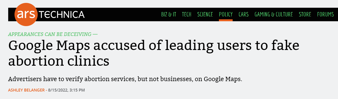 Anti-abortion activists misrepresent their organizations on Google Maps, this is Google's fault for some reason