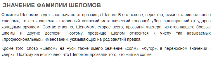 "Family name Shelomov has its start from nickname Shelom. At it's base lies the old word «shelom», that is «shlem», metal helmet"