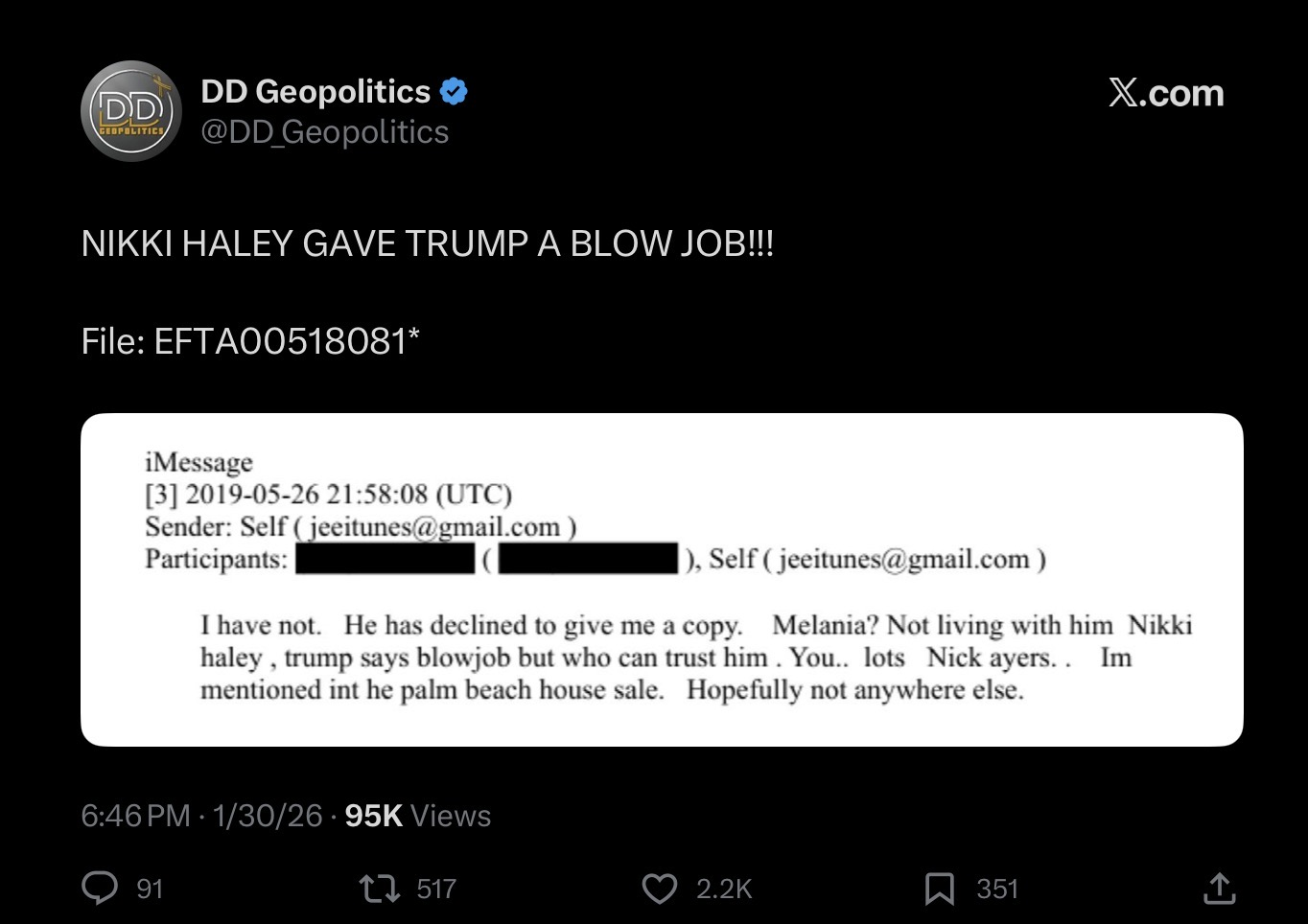@beardalaxy@GrungeQueefI read it as "trump isnt living with his wife", "trump claims to have gotten a blow job from haylee, but didnt give me the file, (everyone should trust me will all the blackmail, so he clearly is lying if he doesnt give me proof)" "I'm in the (paperwork?) palm-beach sell, but hopefully thats all the exposure"