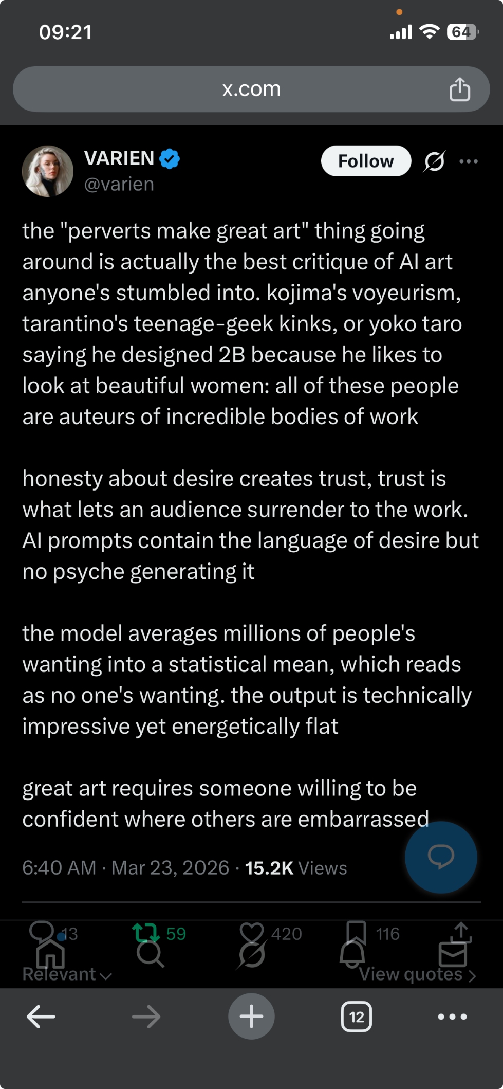 @heavens_feel I don't have the stomach to read what that person wrote but aren't we just accepting the 'pervert' label without any criticism? Were the master of the ancient and renaissance worlds perverts for manifesting perfect beauty? To me this is a postmodern/Marxist framing. Bringing beauty into the world is not an act of perversion, it is an act of healing. As for the 'wanting to bang' aspect, beauty tends to have that effect, but it cannot be reduced to it.