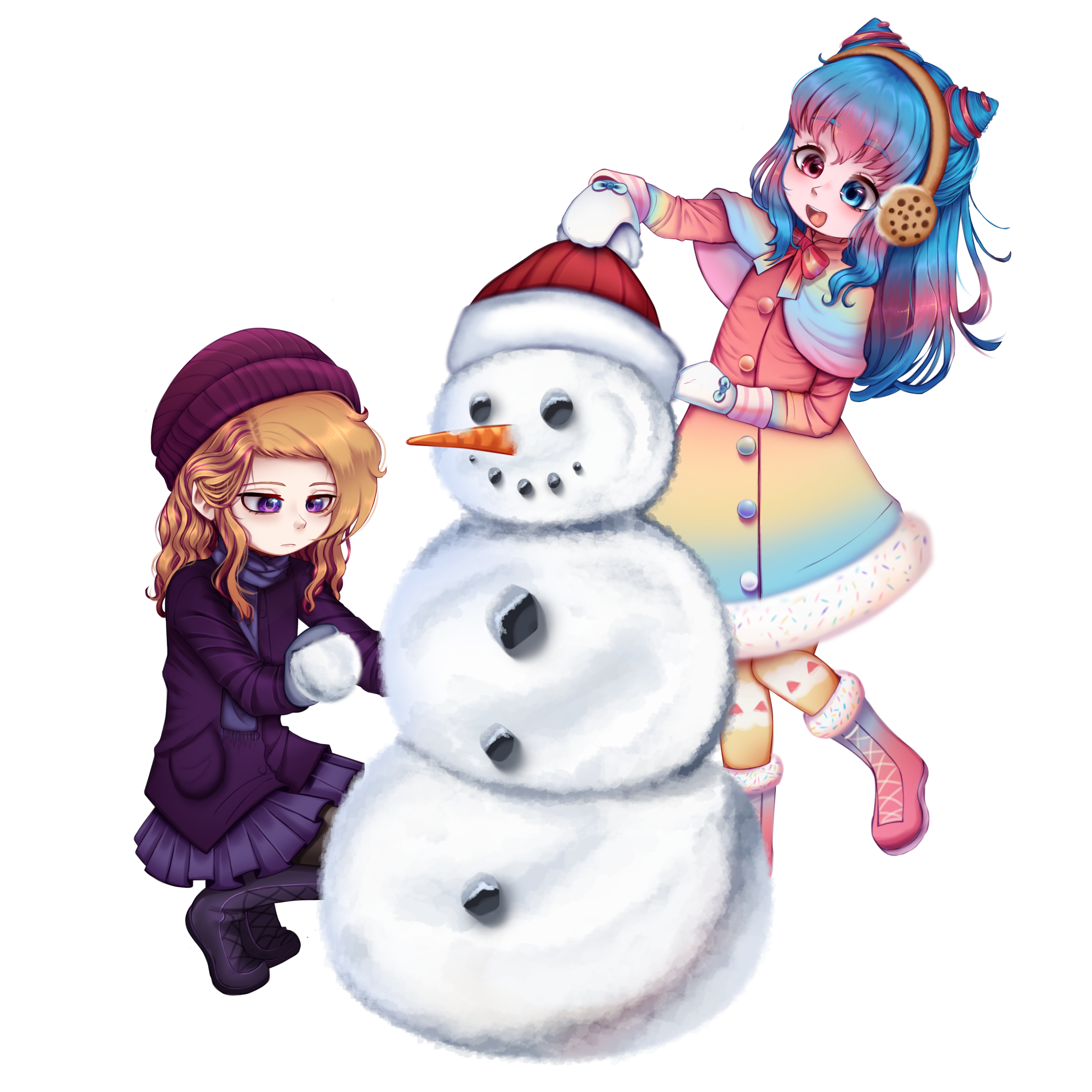 #snow #winter #cute #loli #sfw #jacket #snowman #wholesome #sweet #commission #storm #heterochromia #boots #hat #beanie #carrot #openmouth #art #digitalart #longhair #fullbody #blush #earmuffs #skirt #leggings