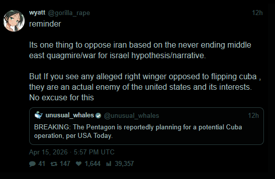 Wyatt says you're an enemy of America if you're not All-In on a ground invasion of Cuba