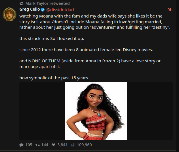 @SuperSnekFriend The closest thing to anything pro-sex or pro-marriage in a modern disney film is Nick Wilde x Judy Hopps shipbaiting in Zootopia, and you know they don't have the balls to actually have those two together. So, the only thing that comes close is Disney blue balling shippers in a bizarre race metaphor furbait movie. Robin Hood and Maid Marian were planning their honeymoon and talking about having a dozen children while Robin was fighting Prince John's henchmen back in 1973, how far have we fallen.