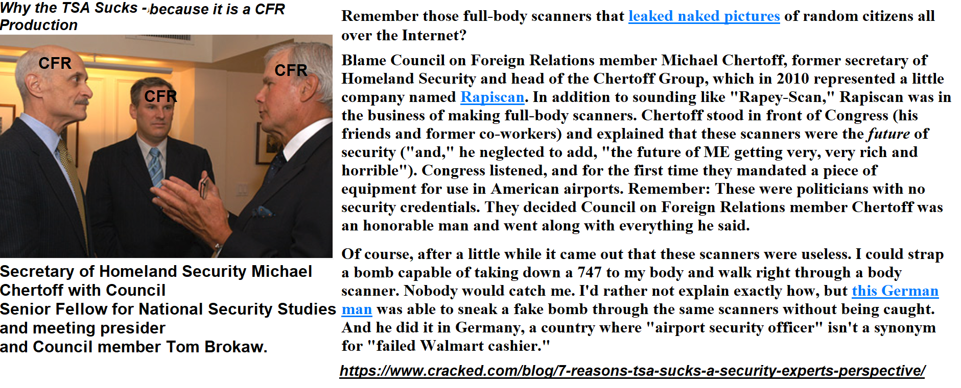 Remember those full-body scanners that leaked naked pictures of random citizens all over the Internet? Blame Council on Foreign Relations member Michael Chertoff, former secretary of Homeland Security and head of the Chertoff Group, which in 2010 represented a little company named Rapiscan. cracked.com/blog/7-reasons-tsa