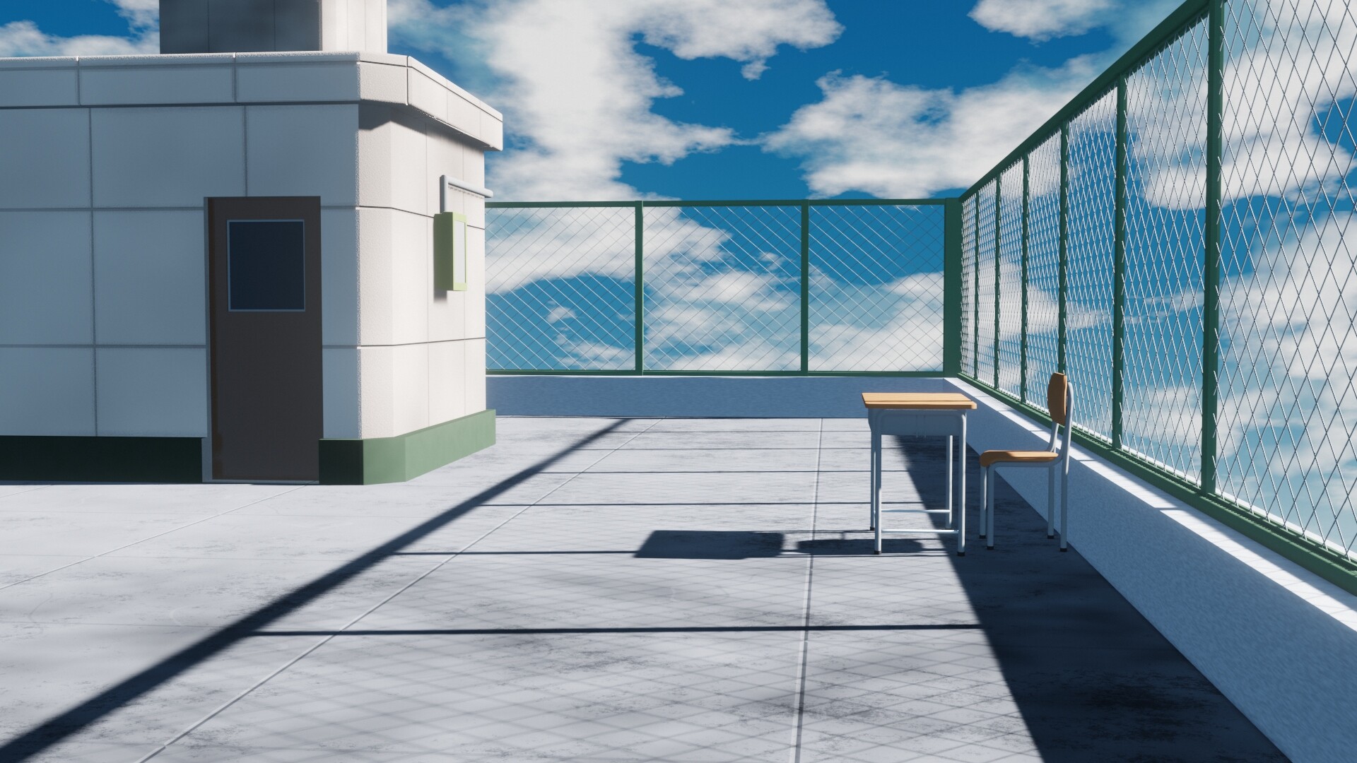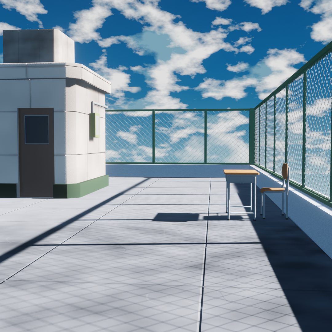 It's a classic school rooftop scene. Wanted to add more stuff so it doesn't look as "alone", but didn't had the time, maybe will explore more the style in a further scene.