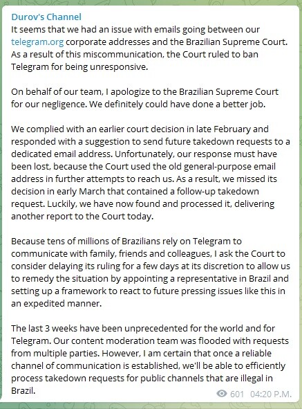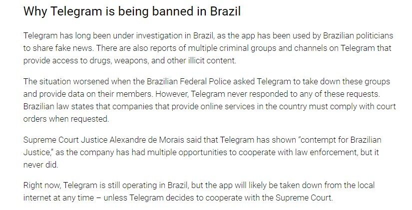 Brazil Supreme Court orders messaging app Telegram to be blocked in the entire country.