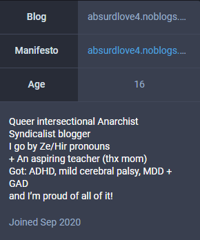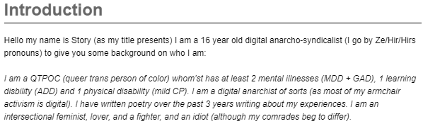 "I am a QTPOC (queer trans person of color) whom’st has at least 2 mental illnesses" is all you need to know ![]()