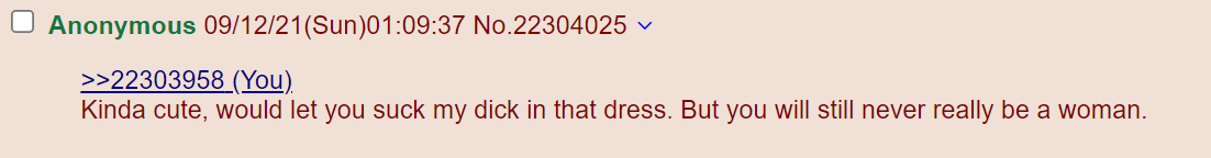 AA is also an absolute butthurt retard by overanalyzing and inserting meaning into replies. Where he says that Nick wants to be an schoolgirl with a penis. No. That's not how the internet works. Nick saw a picture of an attractive woman, maybe said "Nice" in his head and then went into his reaction folder with the thought of "What's a funny reaction that will get me likes". There is no hidden meaning. Just like when I type ROFL, I maybe exhaled more strongly, I'm not rolling on the floor laughing or even desire to do so.