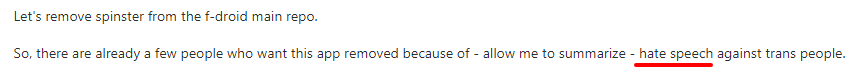 The removal of Spinster from F-Droid is yet another proof how extremely subjective hate speech is and completely unsuitable as a moderation standart.