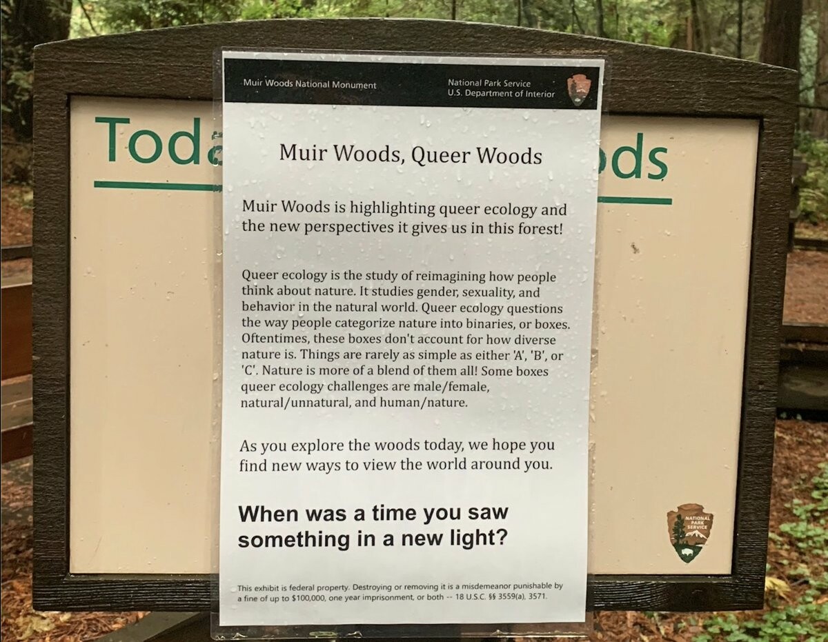 Outside: https://www.nps.gov/muwo/learn/historyculture/queer-ecology.htm