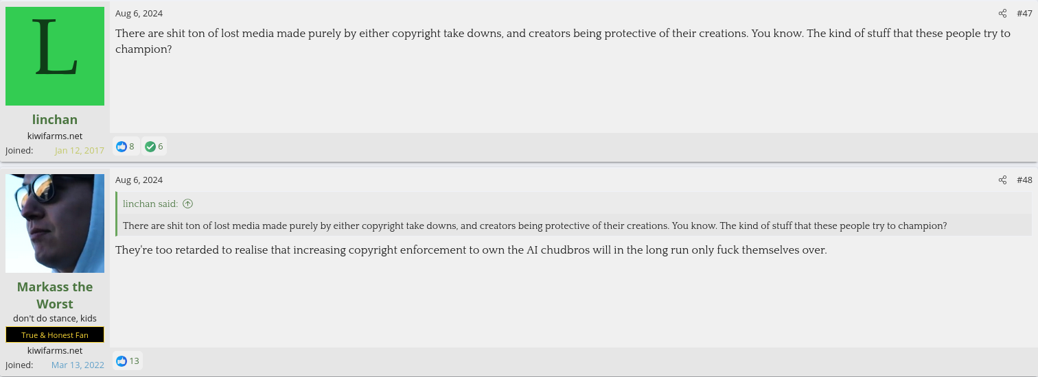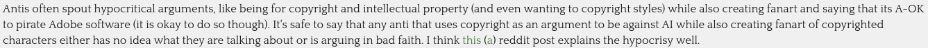 I'm glad that I'm not the only one who realizes the hypocrisy of many of these anti-AI people who want to use copyright to stop generative AI while also supporting piracy, Creative Commons licenses, and creating fan works.
