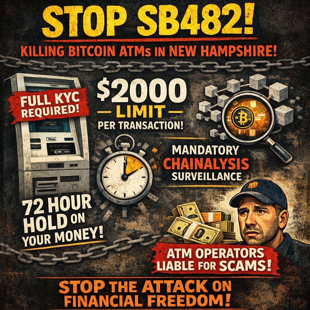 This bill will mandate full KYC for cryptocurrency vending machines, put a $2000 per day limit on purchases, put a 14 day hold on your funds, and make vending operators liable for 3rd party scams if users send their crypto to scammers. It will also mandate chainalysis.