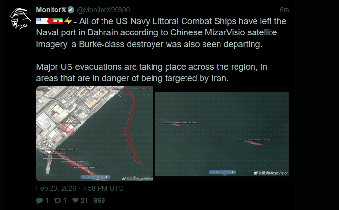 All of the US Navy Littoral Combat Ships have left the Naval port in Bahrain according to Chinese MizarVisio satellite imagery, a Burke-class destroyer was also seen departing.